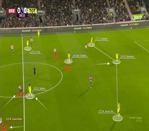 本坦库尔倾向于回撤到中卫之间,这意味着若昂-帕利尼亚被双人盯防,而布伦特福德的紧凑阵型使得佩德罗-波罗和格雷都不是可选的出球点。左后卫杰德-斯彭斯内收带出了迈克尔-凯约德,但基恩-刘易斯-波特迅速填补了空位。